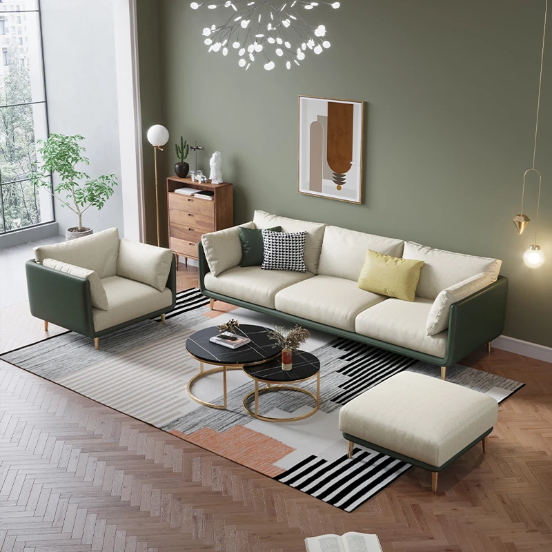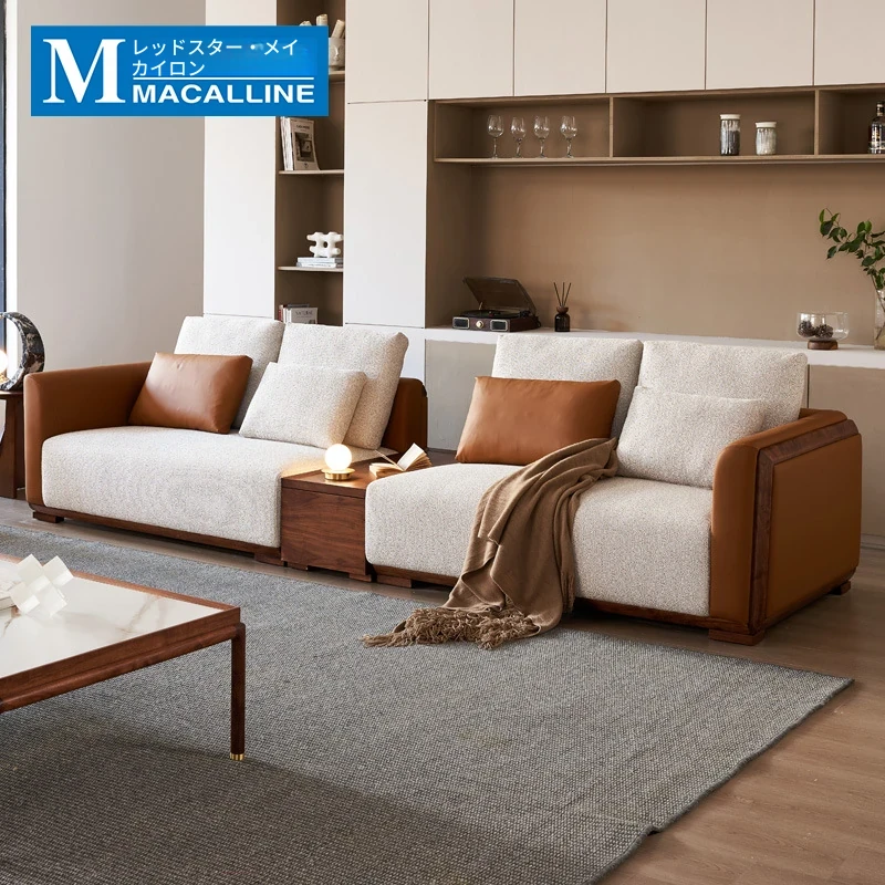 オーシャンジェ実木ミニマリストスタイルのブラックウォールナットレザー&ファブリックソファ - ヴィラや大きなリビングに最適な現代的なコンビネーション家具!